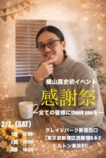 横山真史初のファンイベントを開催いたします。 当日は豪華ゲストをお迎えして楽しい時間を一緒に過ごしましょう! 【タイトル】 感謝祭〜全ての皆様にthank youを〜 【日程・ゲスト】