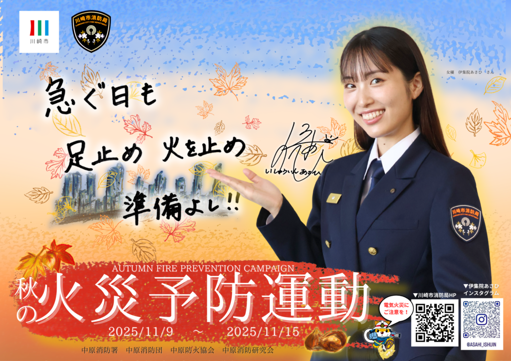 川崎市消防局「秋の火災予防運動」のイメージガールを務める伊集院あさひが、モトスミ防火パレードに出演いたします。